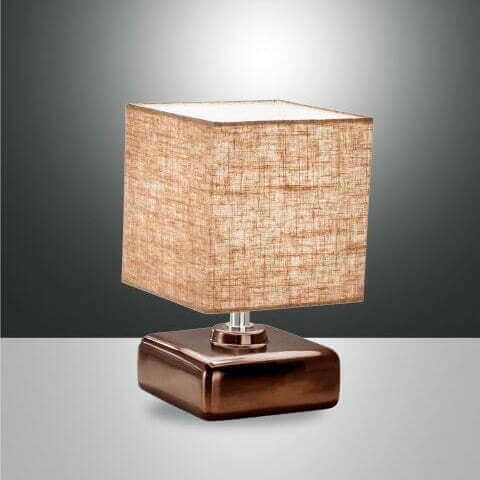 Tafelarmatuur vervaardigd uit metaal,keramiek en stof met een bronskleurige voet en oranje kap. Geschikt voor lichtbron met E14-fitting.